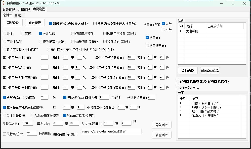 抖音群控留痕系统支持全自动一键批量关注、私信、点赞、评论、收藏等操作。你只需轻点鼠标,即可实现50台手机同步执行指令,大大提高了工作效率。无需繁琐的手动操作,一台电脑即可轻松掌控全局。