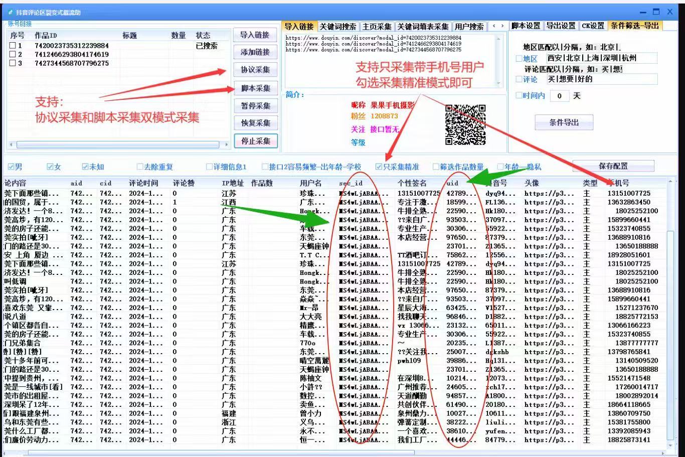 一款多功能采集抖音评论区用户裂变截留软件,功能强大,采集流畅精准,推荐使用,支持脚本/协议自定义双模式采集抖音视频及评论区用户并导出详细信息资料。